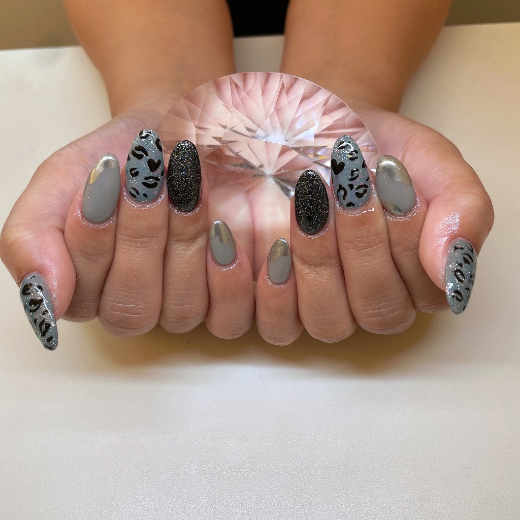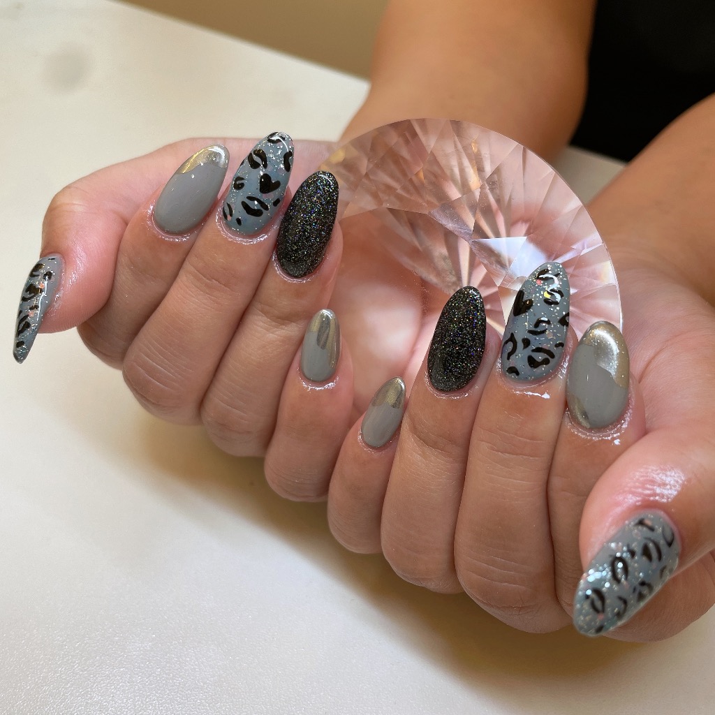 今回のネイルは前もってやりたいデザインがありそれをネイリストにやってもらいました💅秋っぽくグレーを使いやりたかったレオパード柄を入れてシルバーのミラーを入れもうとっっっっても可愛いネイルになりました♡