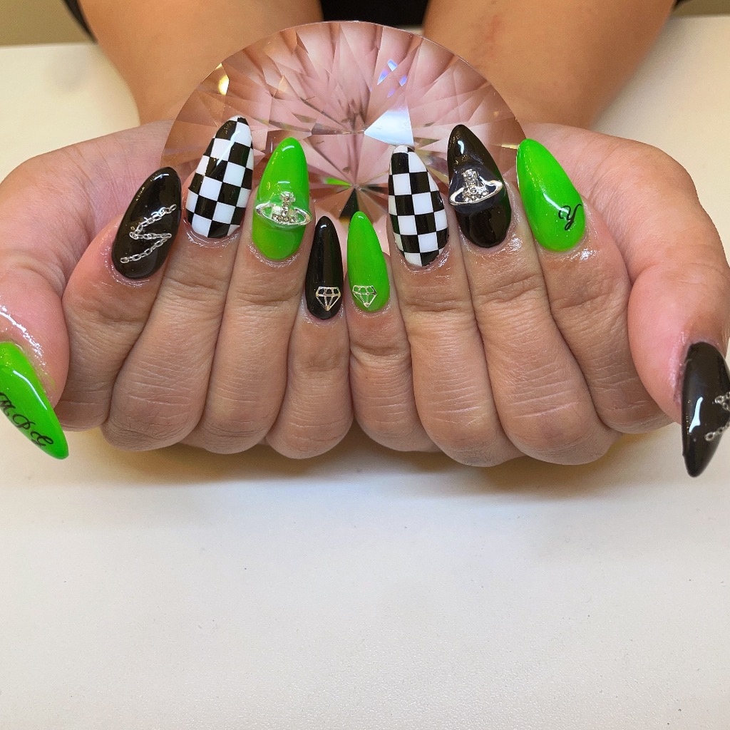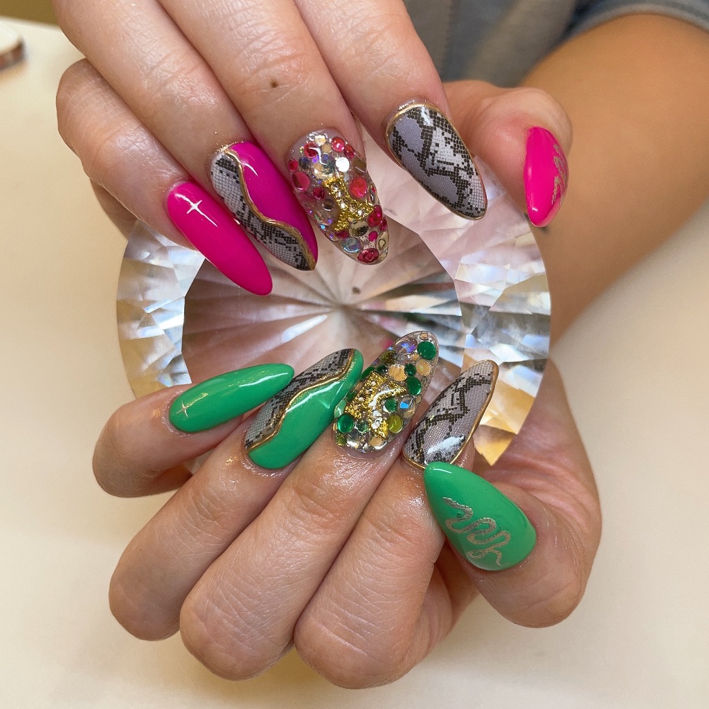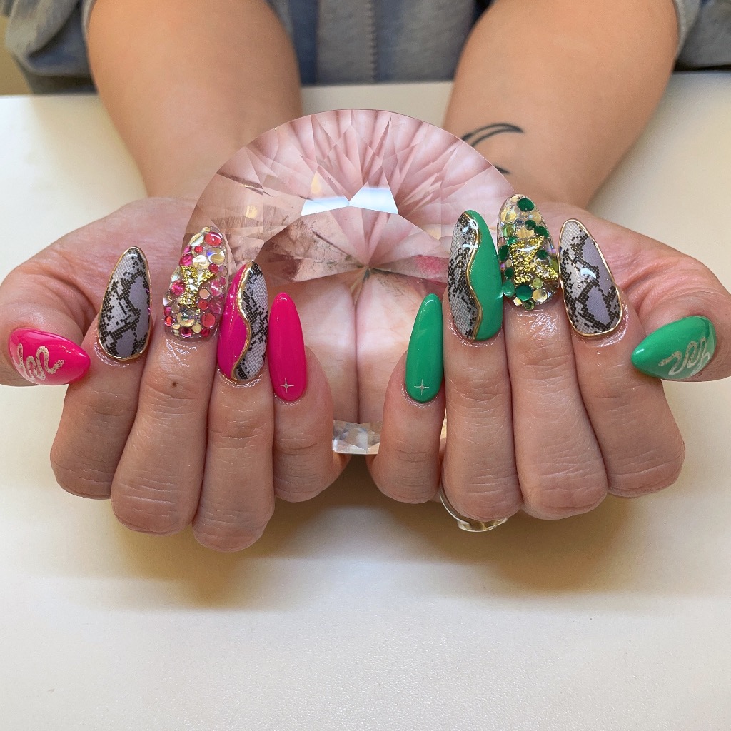 今回パイソン柄のネイルをしたいって言っていて施術前からとってもワクワクしていました😍ピンクと緑をベースにパイソン柄と埋めつくしとさり気なくイニシャルのパーツもつけていました!!