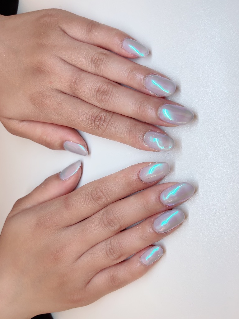 お客様が紫ベースでオーロラパウダーつけるネイルをやりたいと言っておりそれをやったのですがもう施術の途中から可愛いのが分かって施術中ワクワクしながらやってました。笑