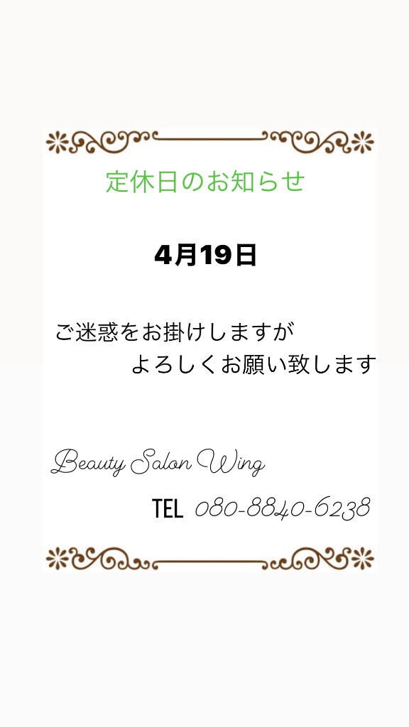 ビューティーサロンウィングは火曜〜土曜11時〜18時まで営業しております。